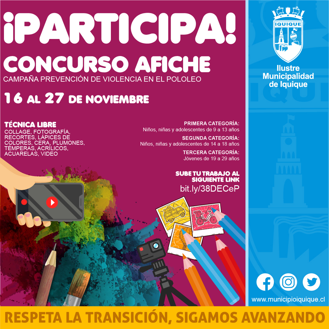 Una invitación a participar del concurso “Campaña de prevención de violencia en el pololeo”, el que es impulsado por la Oficina de la Mujer de la Dirección de Desarrollo Comunitario (Dideco), es la que realiza la Municipalidad de Iquique a los niños y niñas, desde los 9 años, adolescentes y jóvenes hasta los 29 años, 11 meses y 30 días.