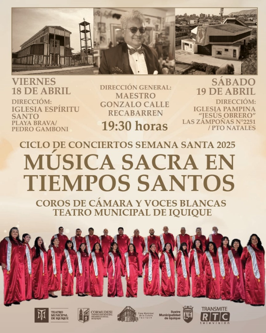 Como ya es tradición desde hace 36 años en esta fecha, los Coros de Cámara y Voces Blancas del Teatro Municipal de Iquique realizarán conciertos de acceso liberado por Semana Santa, los que llevan por nombre “Vida, Pasión, Muerte y Resurrección de Nuestro Señor Jesucristo”.