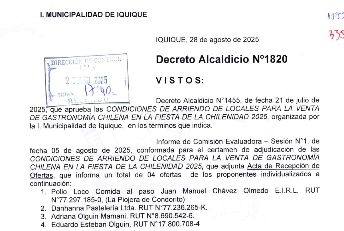 Se encuentra disponible el Decreto Alcaldicio N°1820, de fecha 28 de agosto del 2025, el cual adjudica las condiciones de arriendo para locales de venta de gastronomía chilena en el evento denominado "FIESTA DE LA CHILENIDAD" año 2025.