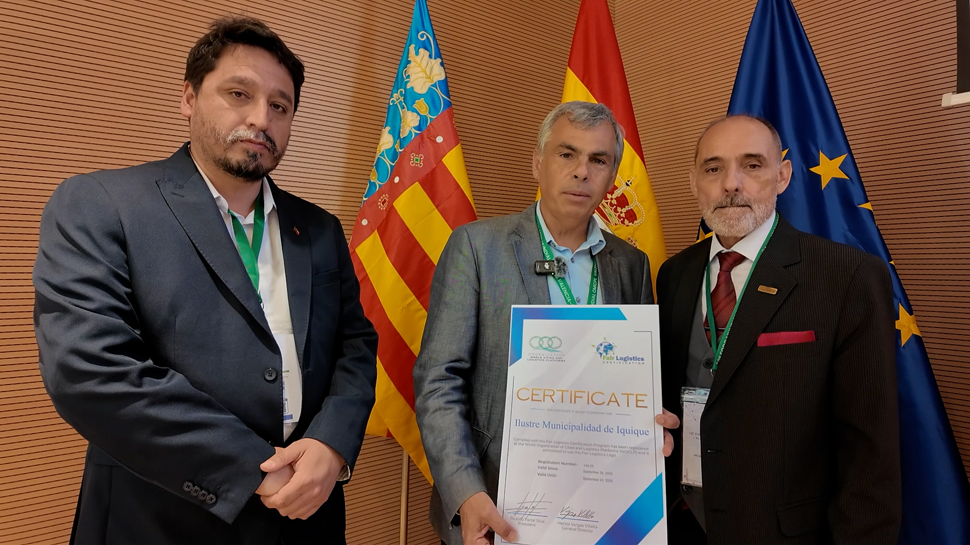VALENCIA, ESPAÑA; 25 DE SEPTIEMBRE DE 2025.- Por ser una institución pública que promueve el desarrollo de la logística en esta parte del mundo, dada su relevancia para el proyecto de progreso de la ciudad que impulsa hace más de 60 años, y por buscar que esta actividad cumpla con estándares modernos de ejecución; la Municipalidad de Iquique fue reconocida con la certificación del Programa Internacional de Logística Justa, conocido internacionalmente como Fair Logistics, por parte de la Organización Mundial de Ciudades y Plataformas Logísticas, OMCPL.