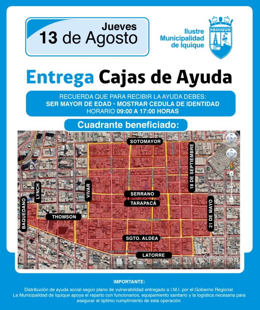 Así es como hoy se repartieron 3.300 mil canastas de víveres en el cuadrante de calle Ernesto Riquelme y Avenida Elías Lafertte, por el norte; calle Brigadier Hernán Fuenzalida y Avenida Diego Portales, por el sur; Avenida Salvador Allende por el oriente y Avenida Héroes de La Concepción y calle Luis Cruz Martínez, por el poniente.