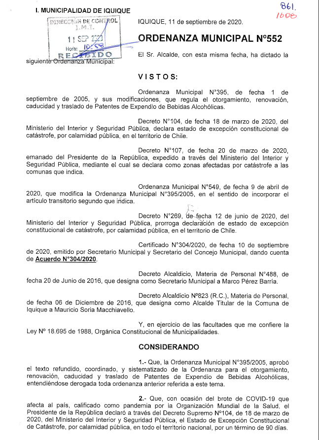 De esta forma, los ediles aprobaron modificar el texto del Artículo Transitorio 2° de la Ordenanza Municipal N°549, de Abril de este año el que, a su vez, modifica a la Ordenanza Municipal N°395 del año 2005 sobre Otorgamiento, Renovación, Caducidad y Traslado de Patentes de Expendio de Bebidas Alcoholicas para que el cierre de las botillerías pase a ser desde las 18 horas, como rige actualmente, a una hora antes del inicio del toque de queda vigente en todo el territorio nacional en el contexto del Estado de Excepción Constitucional de Catástrofe declarado por la pandemia del Covid-19, según lo que se señala en la Ordenanza Municipal N°552.