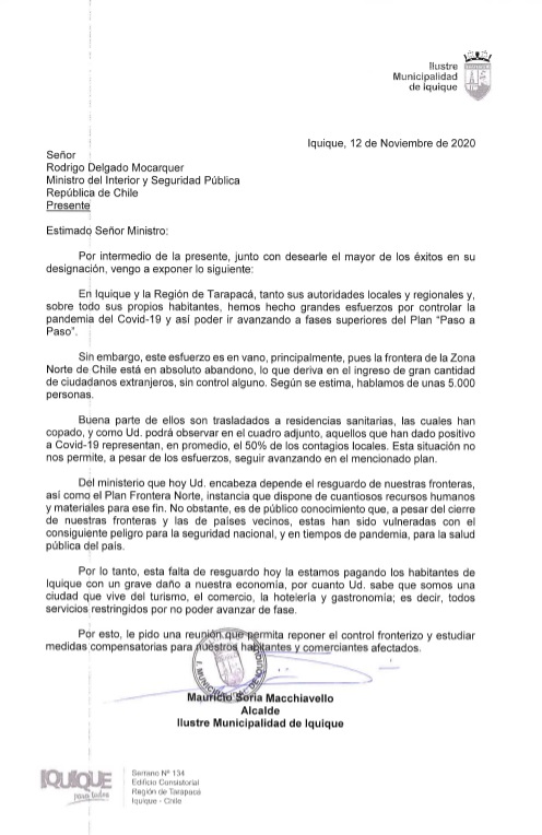 “Del ministerio que hoy Ud. encabeza depende el resguardo de nuestras fronteras, así como el Plan Frontera Norte, instancia que dispone de cuantiosos recursos humanos y materiales para ese fin. No obstante, es de público conocimiento que, a pesar del cierre de nuestras fronteras y las de países vecinos, estas han sido vulneradas con el consiguiente peligro para la seguridad nacional, y en tiempos de pandemia, para la salud pública del país”, reza parte de la misiva que Soria Macchiavello envió a Santiago solicitando la cita con el recién nombrado ministro.“Esto no se trata de xenofobia. Quienes me conocen saben el carácter integracionista que, con los países vecinos y de otras latitudes, hemos intentado imprimirle a Iquique y el país entero ha sido testigo de cuánto apoyo hemos dado a hermanos extranjeros cuando lo han necesitado, con los pocos recursos con que contamos. Esto se trata de que generar una migración ordenada es rol del Estado y este no puede abandonar esa función, menos aún, cuando está en juego la salud y el bienestar de toda una comunidad”, apuntó la autoridad comunal.
