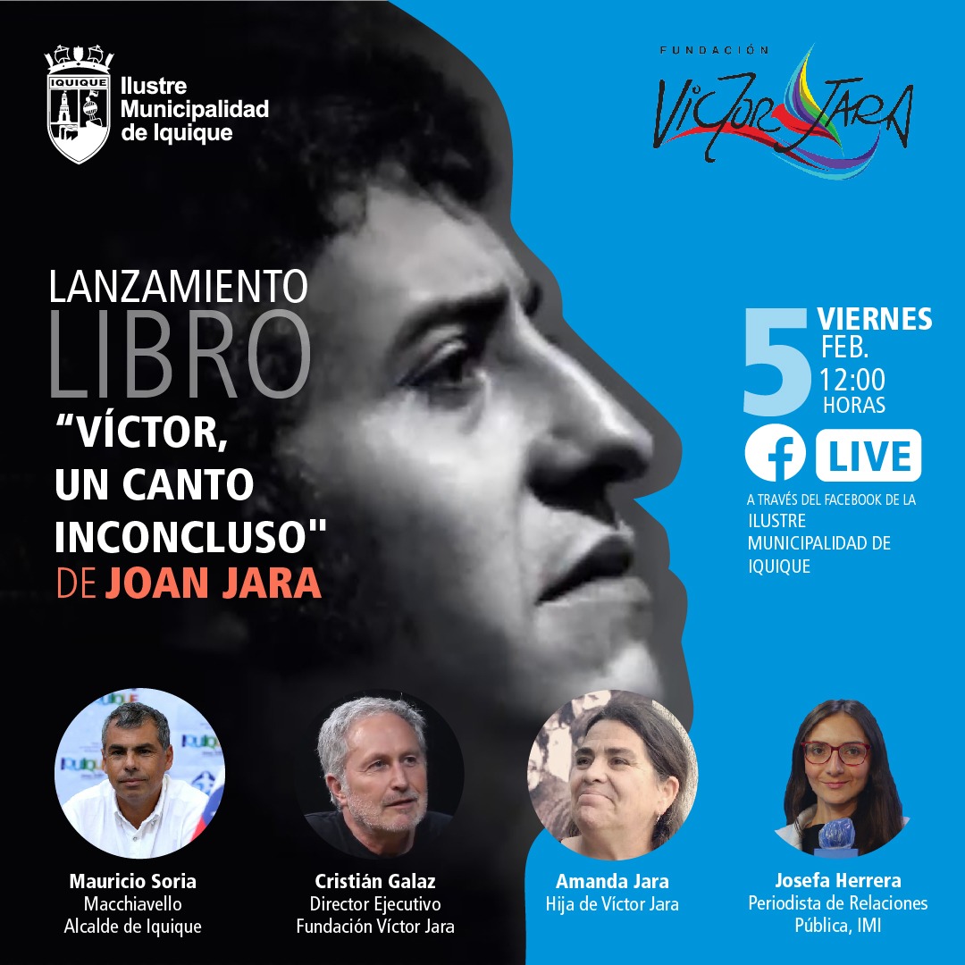Este viernes 05 de febrero, a través del Facebook de la Ilustre Municipalidad de Iquique se transmitirá a las 12:00 horas, en vivo y en directo, el relanzamiento del libro “Víctor, un canto inconcluso”, el que fue escrito en 1983 por Joan Jara, Directora de la Fundación Víctor Jara y esposa del cantautor.