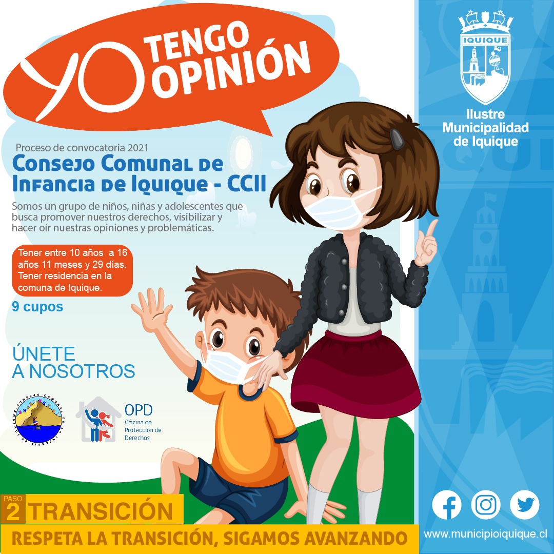 La Oficina de Protección de Derechos de la Infancia, OPD, abrió la convocatoria para que niños, niñas y adolescentes de la comuna postulen e integren el Consejo Comunal de la Infancia de Iquique 2021, el que tiene como tarea desarrollar distintas estrategias de organización, actividades y encuentros con el alcalde de Iquique, Mauricio Soria Macchiavello, y el cuerpo de concejales.