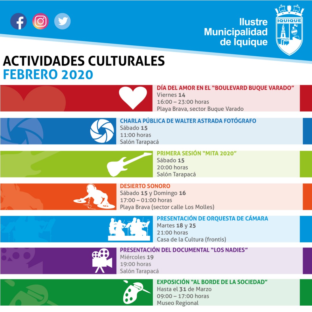 Aunque pareciera que marzo está acechando a la vuelta de la esquina, en la Dirección de Turismo y Cultura de la Municipalidad de Iquique bien saben que aún queda verano y febrero no se dejará ir tan fácilmente. Es por eso que prepararon una variada cartelera de actividades para seguir disfrutando del verano.