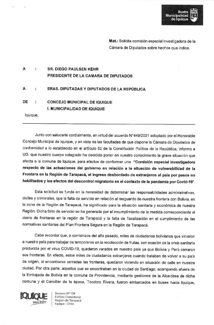 En su última Sesión Ordinaria, celebrada el pasado jueves 16 de septiembre, el Concejo Municipal de Iquique aprobó la iniciativa de solicitar a la Cámara de Diputadas y Diputados la conformación de una Comisión Investigadora que ahonde en las responsabilidades administrativas, civiles y criminales que caben respecto de la Crisis Migratoria que afecta hoy a Tarapacá, incluida la capital regional.