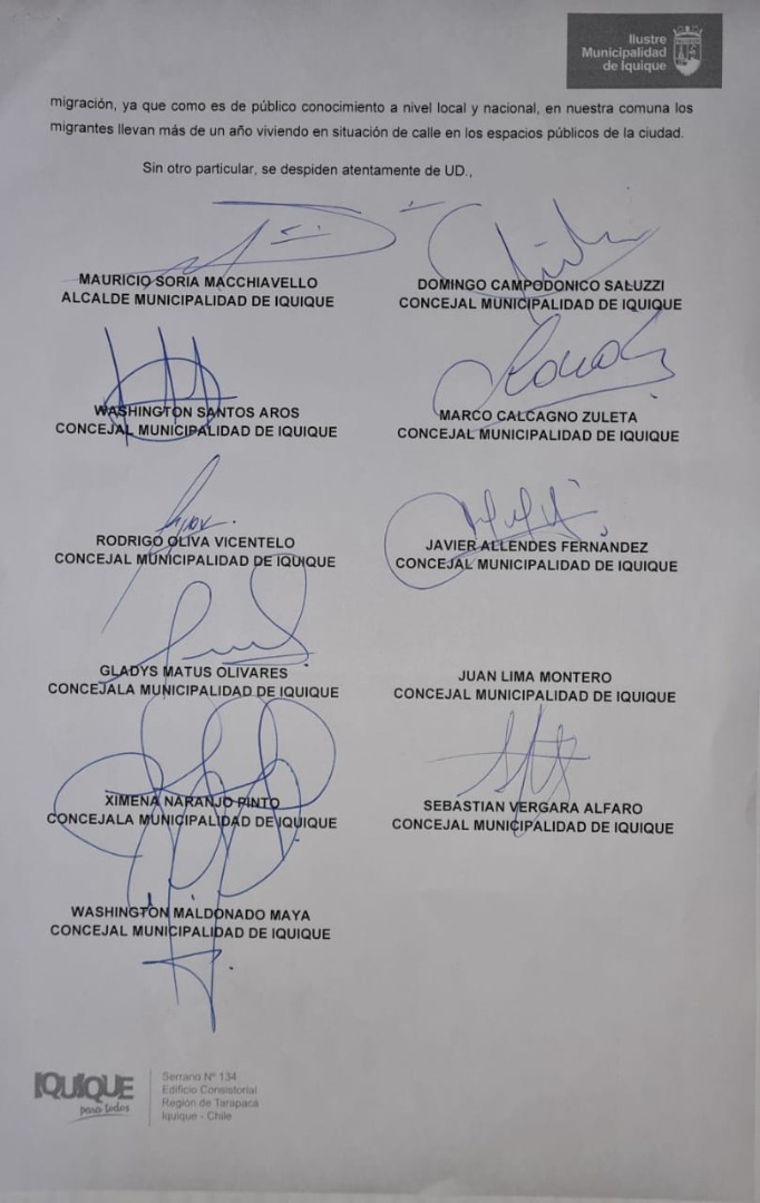 Esa determinación del total de las y los ediles más el alcalde Mauricio Soria Macchiavello fue ratificada con la redacción final del texto y la firma del oficio por parte de cada uno de los integrantes del concejo. “Apelamos a las facultades que estos parlamentarios, en especial los de nuestra zona, tienen por ley para que indaguen y determinen quienes aquí han dejado de cumplir con los mandatos que tiene el Estado respecto del resguardo de nuestras fronteras, del control migratorio y el incumplimiento de tratados firmados por Chile respecto de quienes ya han ingresado a nuestro territorio”, expresó el alcalde Mauricio Soria Macchiavello.