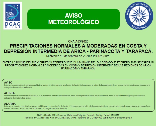 Recordamos que según el sitio web de la Dirección Meteorológica de Chile un aviso es un “informe meteorológico de carácter cualitativo, que es emitido con una antelación de hasta 5 días previos al inicio de la ocurrencia de un evento meteorológico que alcanza una categoría de normal a moderado”.