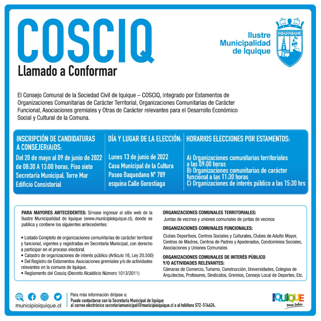 Tal como lo establece la normativa vigente, la Municipalidad de Iquique abre el llamado a conformar el Consejo Comunal de la Sociedad Civil de Iquique, COSCIQ, para el período correspondiente entre los años 2022 y 2026. Este llamado debió realizarse en abril de 2020, sin embargo, dadas las circunstancias propias de la pandemia del Covid-19, se suspendió hasta que las condiciones sanitarias permitieran llevarlo a cabo.
