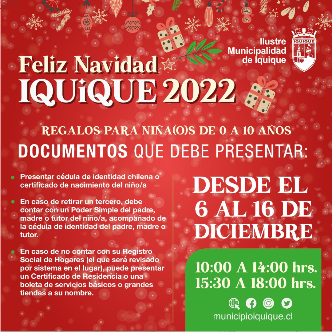 Desde este martes 6 al jueves 15 de diciembre, de 10 a 14 y de 15:30 a 18 horas, se realizará la entrega de regalos y respectiva fiesta para el área urbana de la comuna y, también, para las caletas del litoral sur, en el Estadio Municipal de Cavancha.