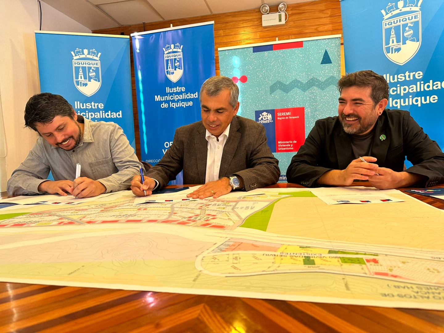 Con el estampado de las respectivas firmas del seremi Diego Rebolledo; del director regional (S) Juan Pablo Sepúlveda y del alcalde de Iquique, Mauricio Soria Macchiavello; la Secretaría Regional Ministerial de Vivienda y Urbanismo de Tarapacá, el Servicio de Vivienda y Urbanización de Tarapacá y la Municipalidad de Iquique formalizan un convenio que permitirá a los primeros dos organismos entregar asesoría técnica al tercero en el marco del Plan de Emergencia Habitacional impulsado por el Gobierno del Presidente Gabriel Boric.