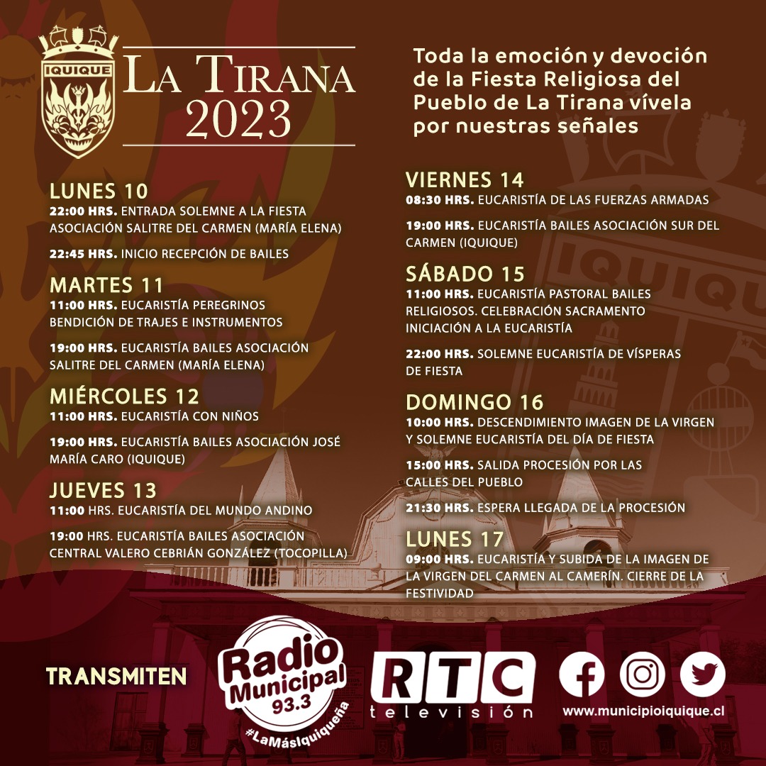 Si bien la cobertura de Radio Municipal y RTC Televisión para las actividades en el Santuario de La Tirana comenzó el pasado sábado 8, con la participación de 1.800 personas mayores en una eucaristía y un almuerzo de camaradería, gracias a una gestión de la Municipalidad de Iquique, la fiesta en sí comienza este Lunes 10 y culmina el Lunes 17 de julio, con las siguientes transmisiones: