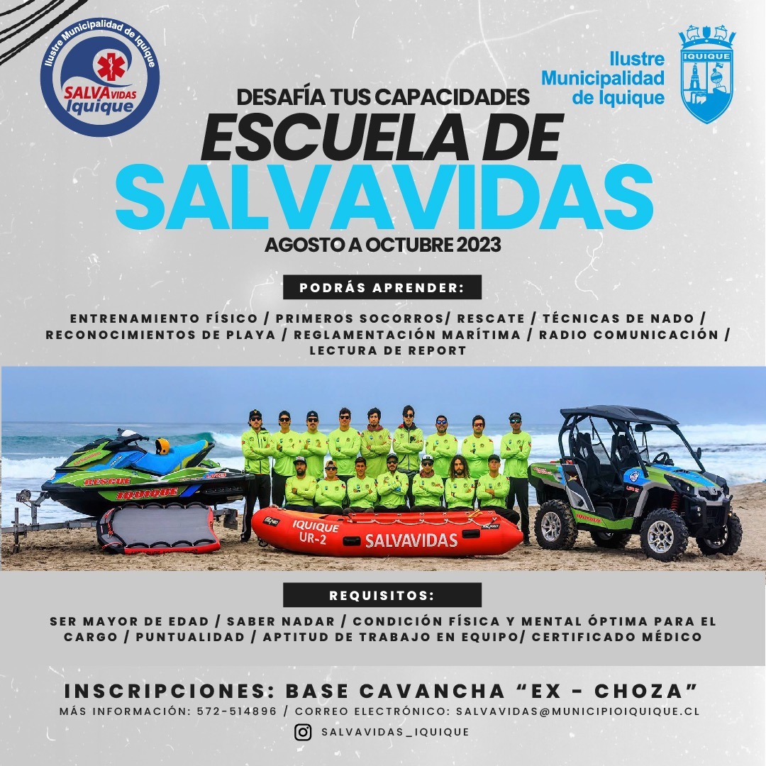 Si deseas ser parte del equipo que resguarda las playas de nuestro litoral a lo largo del año, no dejes pasar la oportunidad de inscribirte en la ESCUELA DE SALVAVIDAS 2023 de la Municipalidad de Iquique.