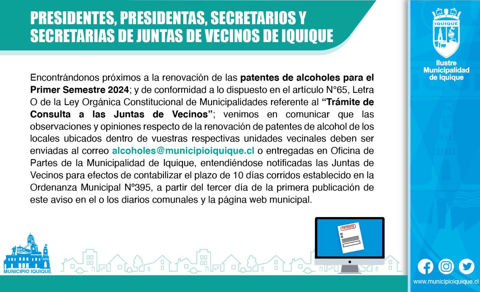 Un llamado a los presidentes, presidentas, secretarios y secretarias de Juntas de Vecinos de la comuna, es el que realiza la Municipalidad de Iquique en el marco de la próxima renovación de las patentes de alcoholes para el Primer Semestre de 2024, para que realicen sus observaciones y opiniones respecto de la renovación de patentes de alcohol de los locales ubicados dentro de sus respectivas unidades vecinales.