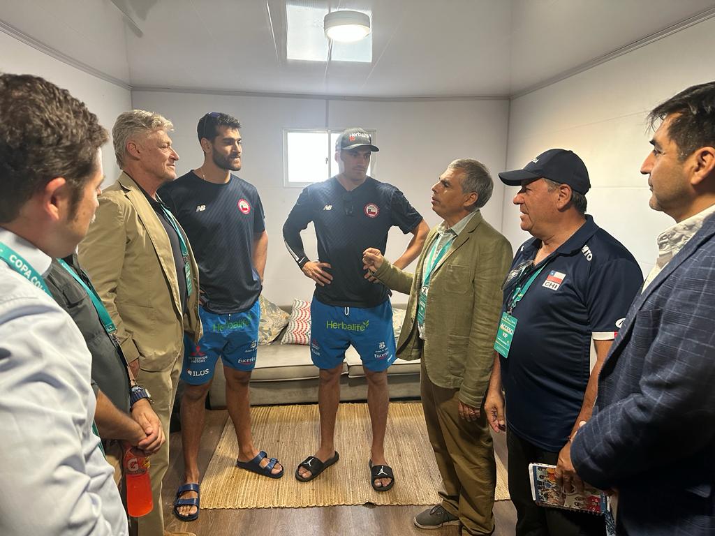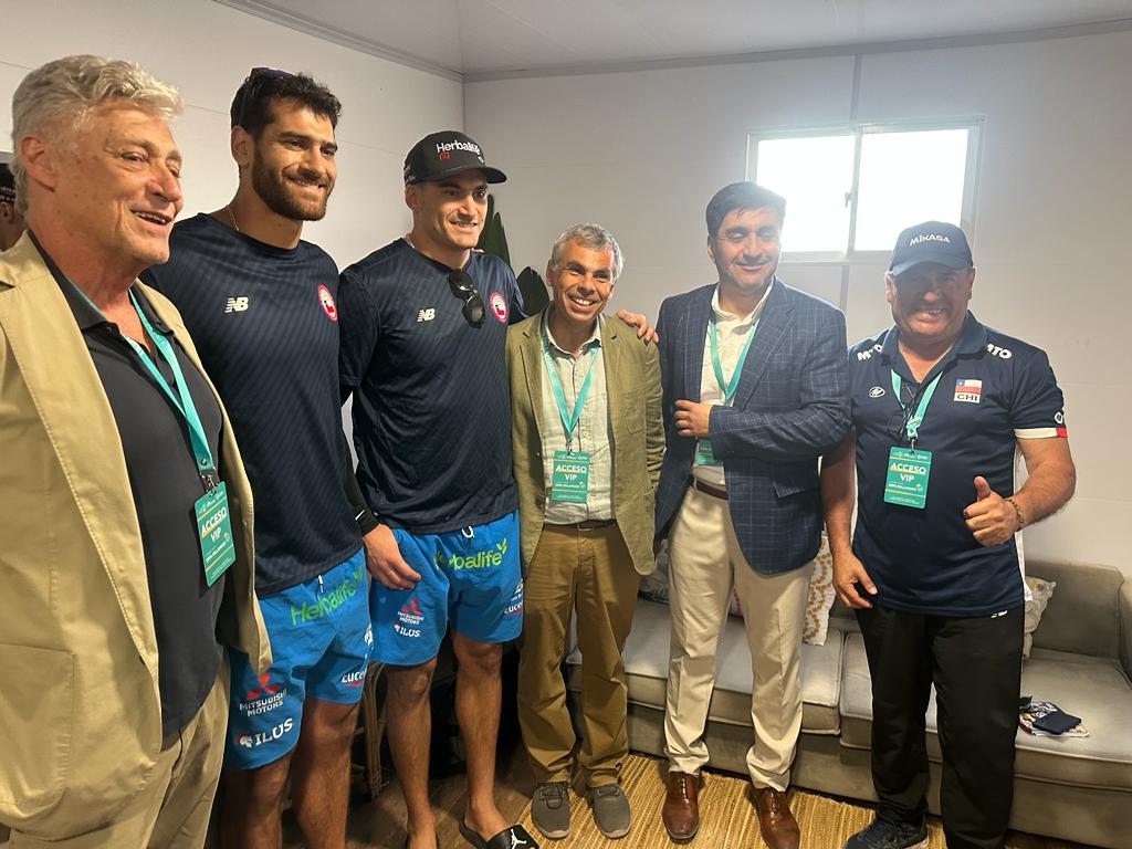 En el mismo Arena Cavancha, el jefe comunal pudo compartir con los queridos PRIMOS GRIMALT, ESTEBAN y MARCO GRIMALT, seleccionados nacionales de vóleibol playa y medallistas en Lima 2019 y Santiago 2023 quienes realizaron un partido de exhibición en la jornada final de la Liga Nacional de menores de Voley-playa, Liname 2023 "Copa Collahuasi".