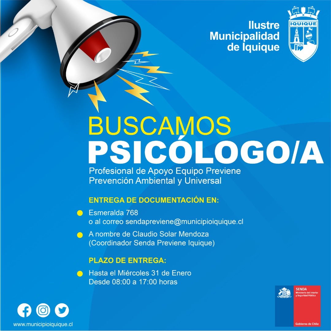 La Municipalidad de Iquique junto al Servicio Nacional para la Prevención y Rehabilitación del Consumo de Drogas y Alcohol (SENDA), a través del Programa SENDA-PREVIENE, están buscando contratar a un(a) PROFESIONAL DE APOYO EQUIPO PREVIENE-PREVENCIÓN AMBIENTAL Y UNIVERSAL (PSICÓLOGO/A).