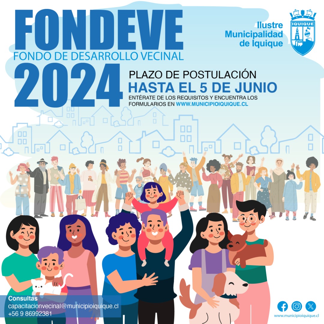 Hasta el próximo 5 DE JUNIO, las Juntas de Vecinos de nuestra comuna tienen plazo para presentar sus proyectos y postular a los recursos que otorga la Municipalidad de Iquique, a través del Fondo de Desarrollo Vecinal (FONDEVE), que permitirá obtener hasta 3 millones de pesos por cada iniciativa favorecida.