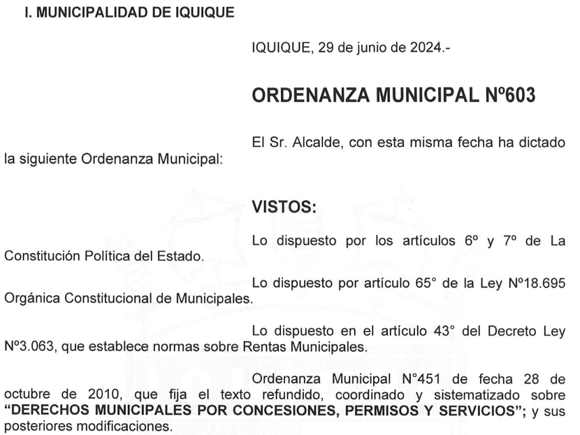 El presente texto modifica la Ordenanza Municipal N°451/2010 sobre “Derechos Municipales por concesiones, permisos y servicios” en relación a la ocupación del espacio público que comprende la totalidad de los estacionamientos subterráneos de Plaza Prat. Aquí puede conocer el texto de la Ordenanza Municipal N°606/2024.