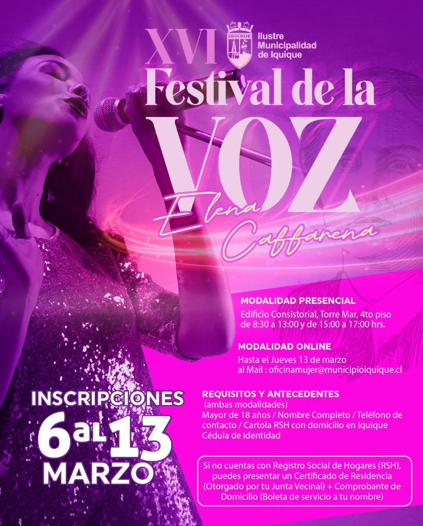 La Municipalidad de Iquique, a través de la Oficina de la Mujer y Equidad de Género de su Dirección de Desarrollo Comunitario, invita a las mujeres de la comuna a ser parte del "XVI FESTIVAL DE LA VOZ “ELENA CAFFARENA”.