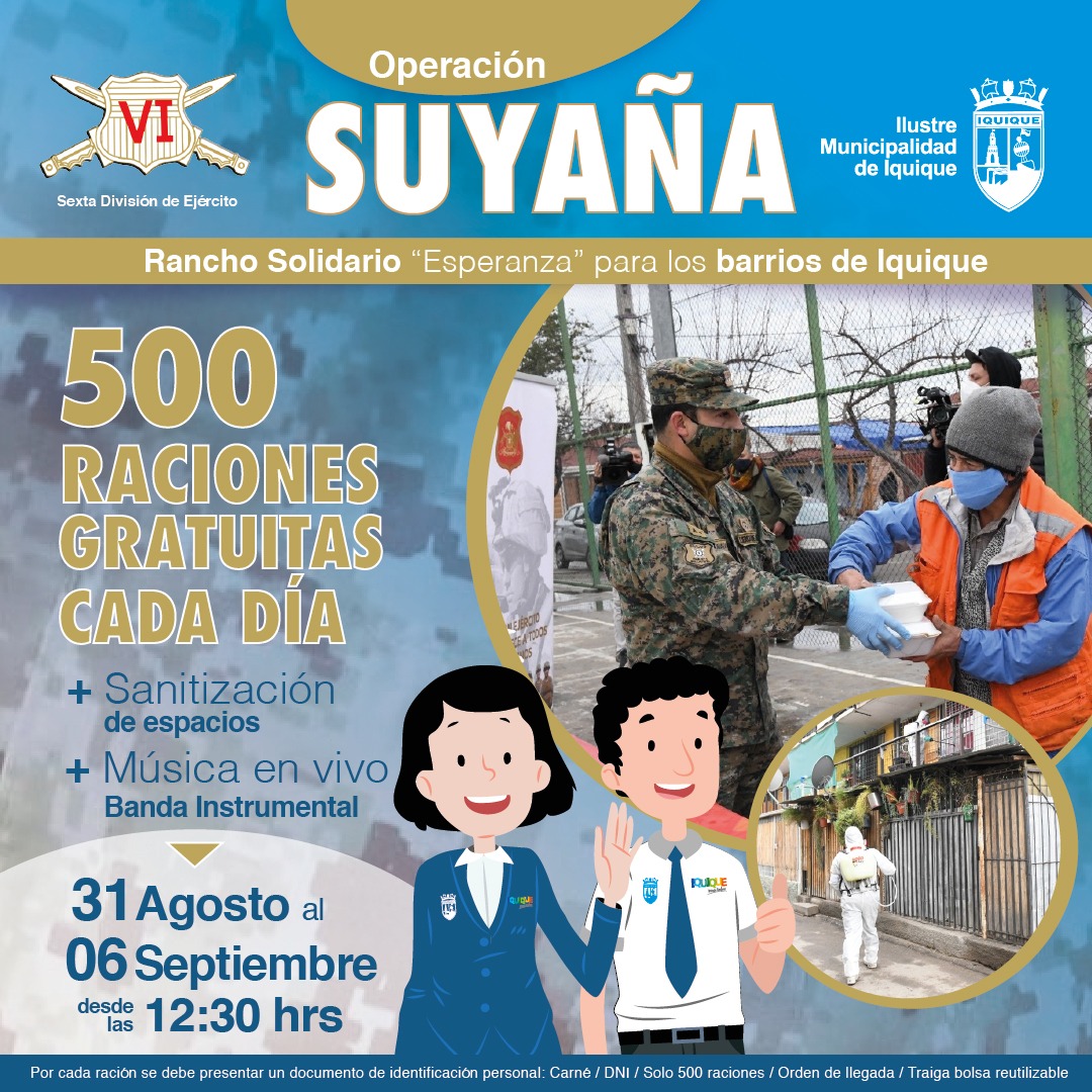 “Operación Suyaña”, que en lengua aymara significa “esperanza”, es el nombre de la actividad que recorrerá Iquique entregando 500 raciones de comida cada día, teniendo en cuenta que el Coronavirus no sólo ha afectado a quienes han contraído la enfermedad, sino también a quienes se han visto impactados por la pérdida de sus puestos de trabajo o la imposibilidad de salir a laborar, debido a la cuarentena.