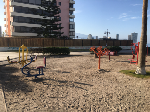 Los trabajos para este gimnasio al aire libre contemplan la instalación de un letrero indicativo, piso de caucho de alto grado de amortiguación y dos tipos de máquinas de ejercicio: Etapa de Objetivo Muscular (8 Máquinas Estáticas de Peso Variable) y para la Etapa de Objetivo Aeróbico (1 Circuito Calistenia más 4 Bicicletas Dínamo, dos para Adultos y dos para niños). En todos los casos, se contempla que estos implementos sean resistentes a la corrosión propia del borde marítimo.