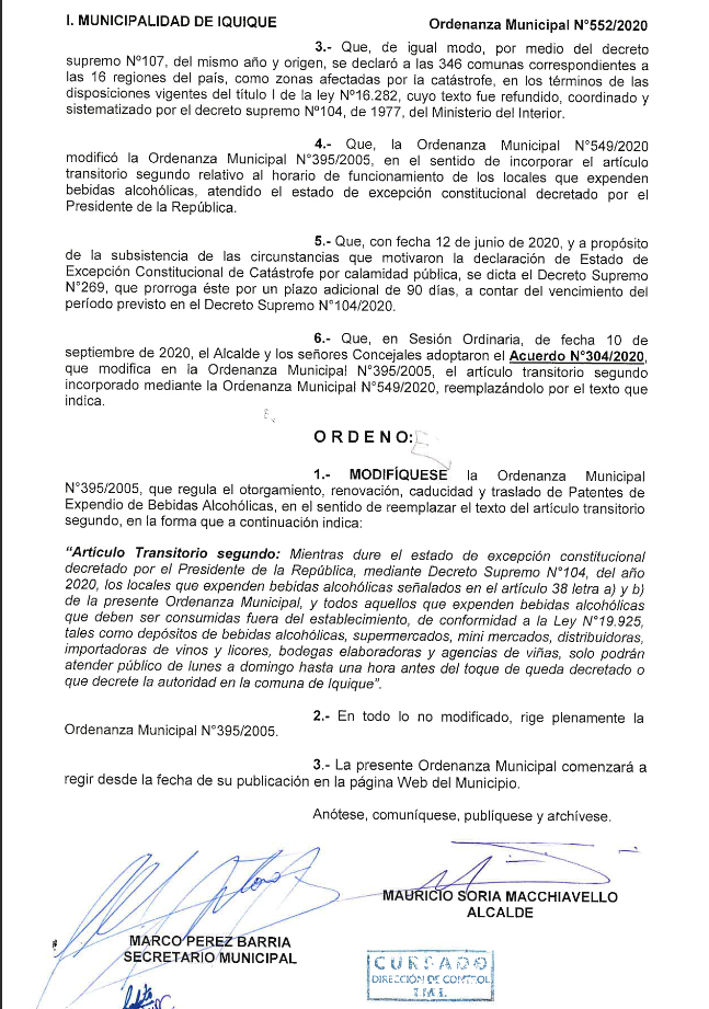 De esta forma, los ediles aprobaron modificar el texto del Artículo Transitorio 2° de la Ordenanza Municipal N°549, de Abril de este año el que, a su vez, modifica a la Ordenanza Municipal N°395 del año 2005 sobre Otorgamiento, Renovación, Caducidad y Traslado de Patentes de Expendio de Bebidas Alcoholicas para que el cierre de las botillerías pase a ser desde las 18 horas, como rige actualmente, a una hora antes del inicio del toque de queda vigente en todo el territorio nacional en el contexto del Estado de Excepción Constitucional de Catástrofe declarado por la pandemia del Covid-19, según lo que se señala en la Ordenanza Municipal N°552.