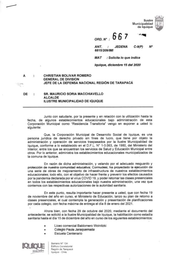 Mediante el Ordinario N°667 el alcalde de Mauricio Soria Macchiavello, en su calidad de presidente del directorio de la Corporación Municipal de Desarrollo Social de Iquique, solicitó a la Jefatura de la Defensa Nacional en Tarapacá la devolución de las escuelas y liceos que, hasta ahora, están siendo utilizadas como residencias transitorias para aquellas personas que no tienen donde realizar sus cuarentenas sanitarias, en el contexto de la pandemia por el Covid-19.