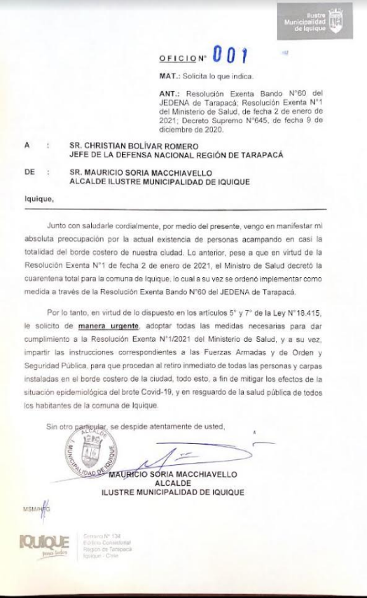 “He enviado un oficio al Jefe de la Defensa Nacional en Tarapacá pidiéndole que adopte las acciones necesarias para desocupar los espacios públicos que hoy están siendo utilizados como verdaderos campamentos. Hay que entender que estamos bajo un Estado de Excepción Constitucional vigente y, en esas circunstancias, es esa autoridad la que tiene las facultades para actuar en materia de resguardo del orden público”, explicó el jefe comunal.