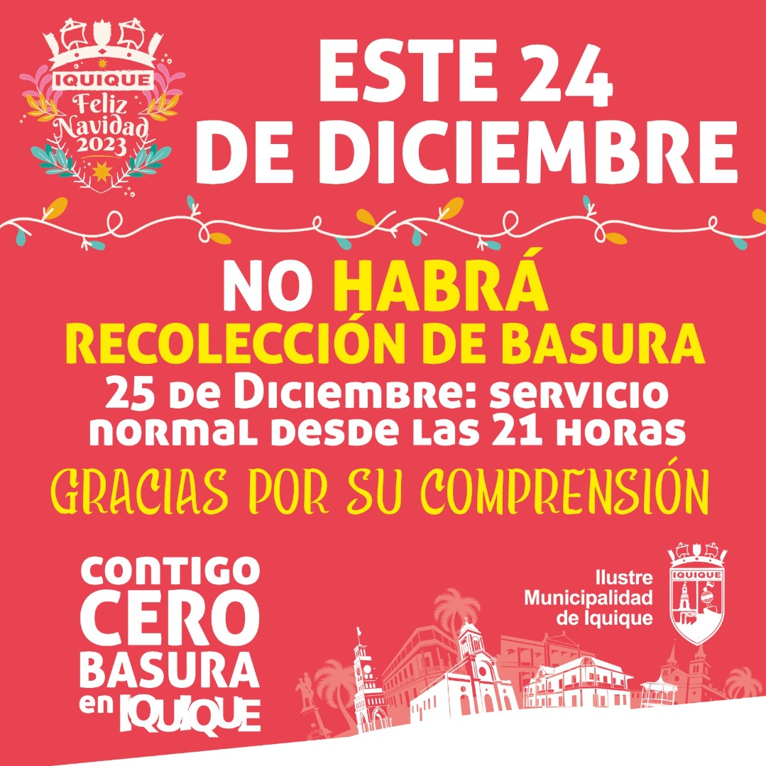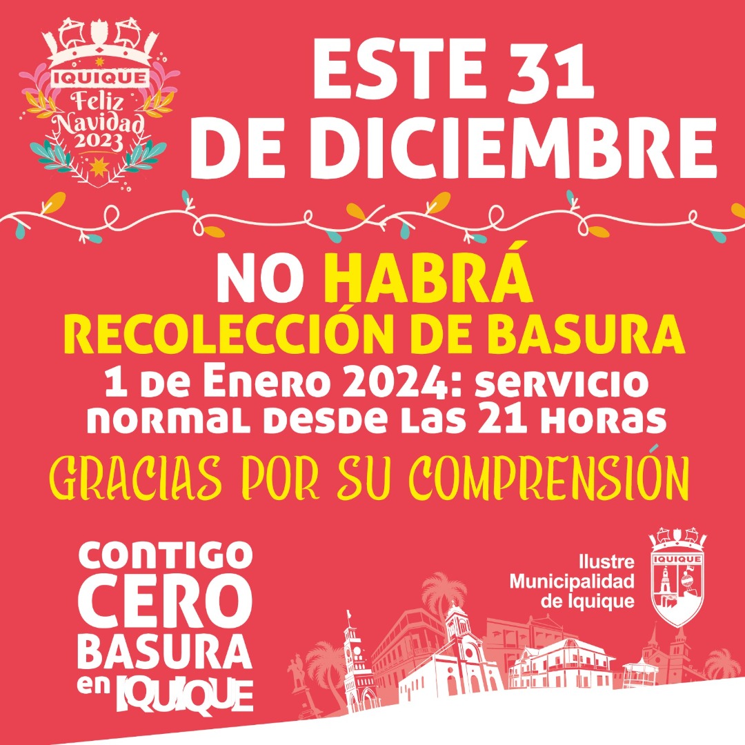 Como cada fin de año, la Municipalidad de Iquique y Cosemar, empresa a cargo de la extracción de basura domiciliaria en nuestra comuna, llaman a respetar la disposición que establece la suspensión de este servicio para las jornadas del domingo 24 y el domingo 31 de Diciembre de 2023, por motivo de las fiestas de Navidad y Año Nuevo, respectivamente.