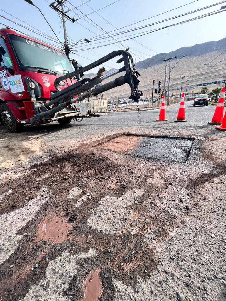 Camión bacheador de la Municipalidad de Iquique recorre la ciudad reparando calzadas