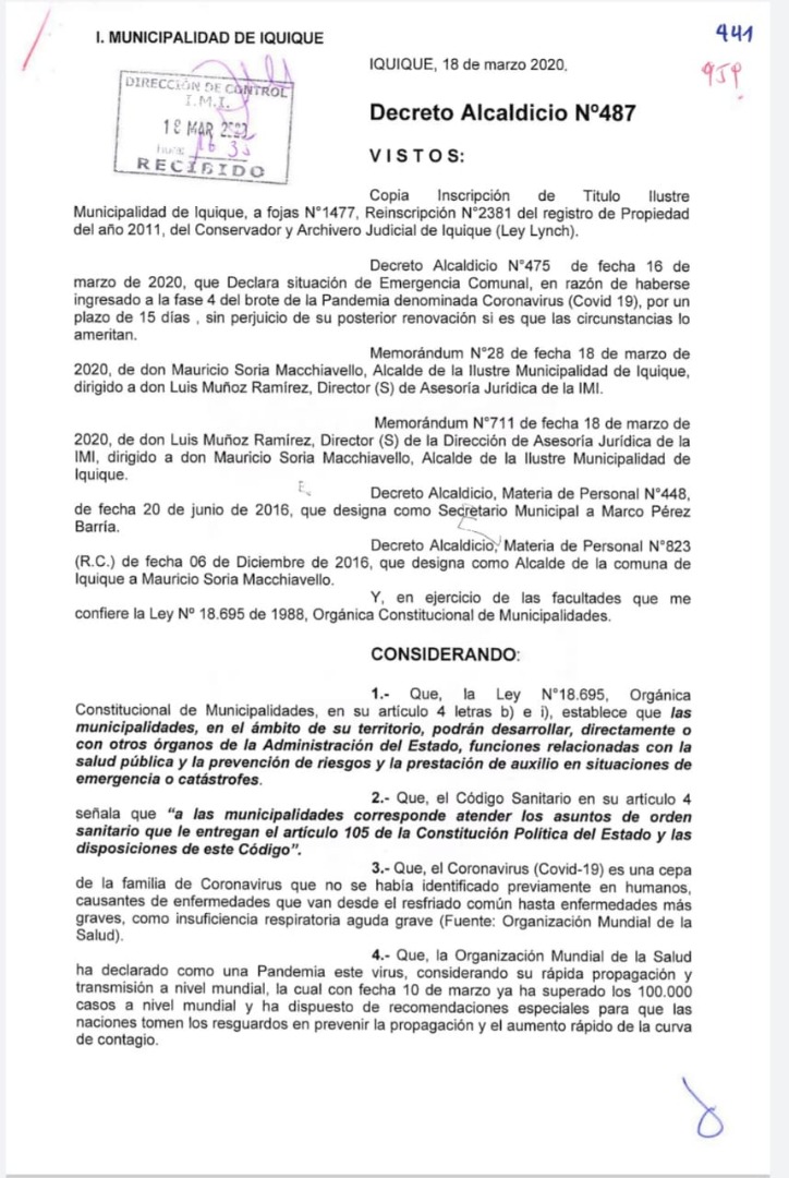 Uno de estos decretos, el N°487/20, establece la prohibición de realizar actividades culturales, recreativas, deportivas o sociales de todo tipo en cualquier espacio público de la comuna. “Queremos que la comunidad entienda que este período no es de vacaciones ni para salir a exponerse a posibles contagios. Nuestra medida busca ser más rígidos en ese sentido, siempre apelando a la responsabilidad de cada uno, respecto de la salud propia y la de los demás”, aseveró al respecto el jefe comunal iquiqueño.