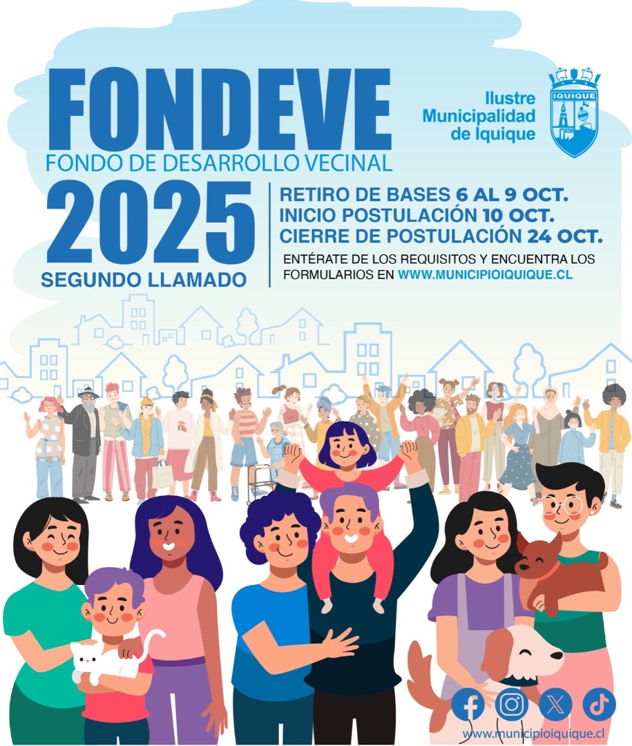 Ya está disponible el cronograma para postular al 2° Llamado del FONDO DE DESARROLLO VECINAL, FONDEVE 2025, de la Municipalidad de Iquique para apoyar iniciativas que surgen desde la comunidad.