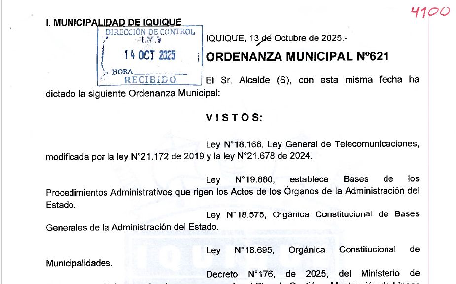Se aprueba Ordenanza Municipal sobre nstalación, mantención y retiro de Líneas Áreas y Subterráneas de Telecomunicaciones en Bienes Nacionales de Uso Público de la comuna de Iquique.