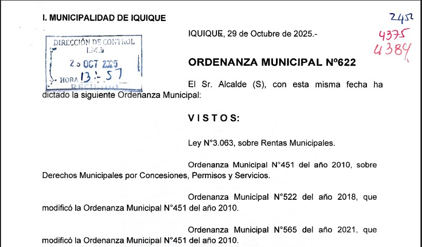 Se aprueba la Ordenanza Municipal N°622/2025 que Modifica la Ordenanza Municipal N°451 del año 2010 sobre "Derechos Municipales por Concesiones, Permisos y Servicios ".