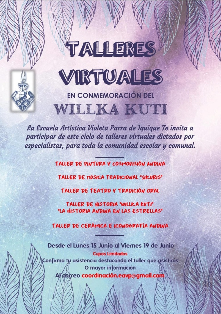 Esta vez, la Coordinación Artística de la Escuela Artística Violeta Parra, establecimiento educacional dependiente de la Corporación Municipal de Desarrollo Social de Iquique, Cormudesi, desarrollará durante toda esta semana talleres en conmemoración del Willka Kuti, los cuales tienen carácter de abiertos y gratuitos.