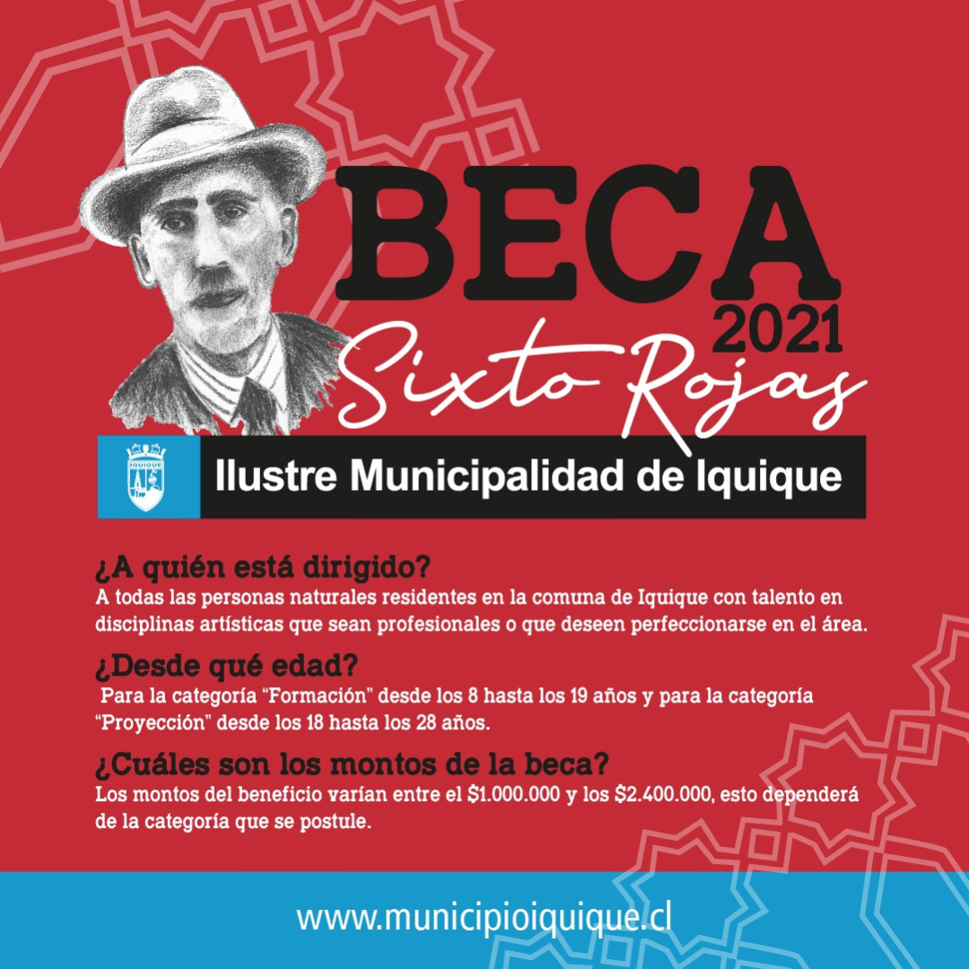 “Debido a la actual condición sanitaria que vive la comuna, las postulaciones a la Beca “Sixto Rojas Acosta” se realizarán a través de la página web de la Municipalidad de Iquique, municipioiquique.cl, y las y los interesados podrán solicitar asesoría y apoyo técnico para participar a nuestra Dirección de Turismo y Cultura, según las fechas establecidas en el cronograma de la beca”, aseveró el propio jefe comunal (S).