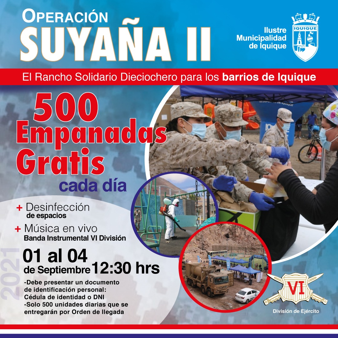 Dado el positivo resultado obtenido en la versión 2020 es que la VI División de Ejército y la Municipalidad de Iquique, una vez más, se han unido para organizar la actividad “Operación Suyaña II”, instancia con la que estas entidades buscan llevar un momento de esparcimiento y alegría a cuatro barrios de la capital regional y así dar el puntapié inicial a las actividades de Fiestas Patrias 2021, aprovechando que la comuna se encuentra en Etapa de Apertura.