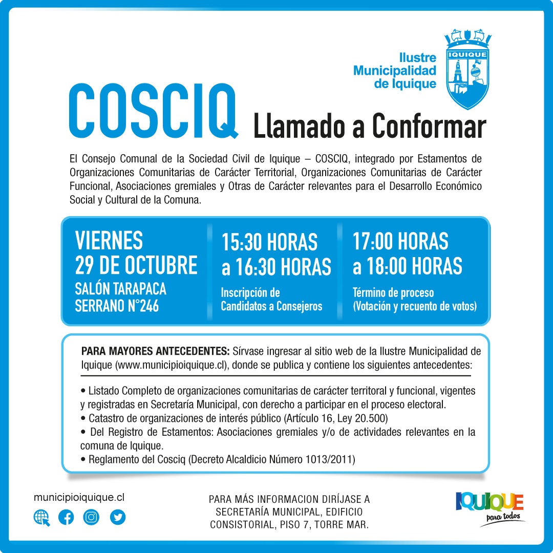 Tal como lo establece la normativa vigente, la Municipalidad de Iquique abre el llamado a conformar el Consejo Comunal de la Sociedad Civil de Iquique, COSCIQ, para el período correspondiente entre los años 2021 y 2024. Este llamado debió realizarse en abril de 2020, sin embargo, dadas las circunstancias propias de la pandemia del Covid-19, se suspendió hasta que las condiciones sanitarias permitieran llevarlo a cabo.
