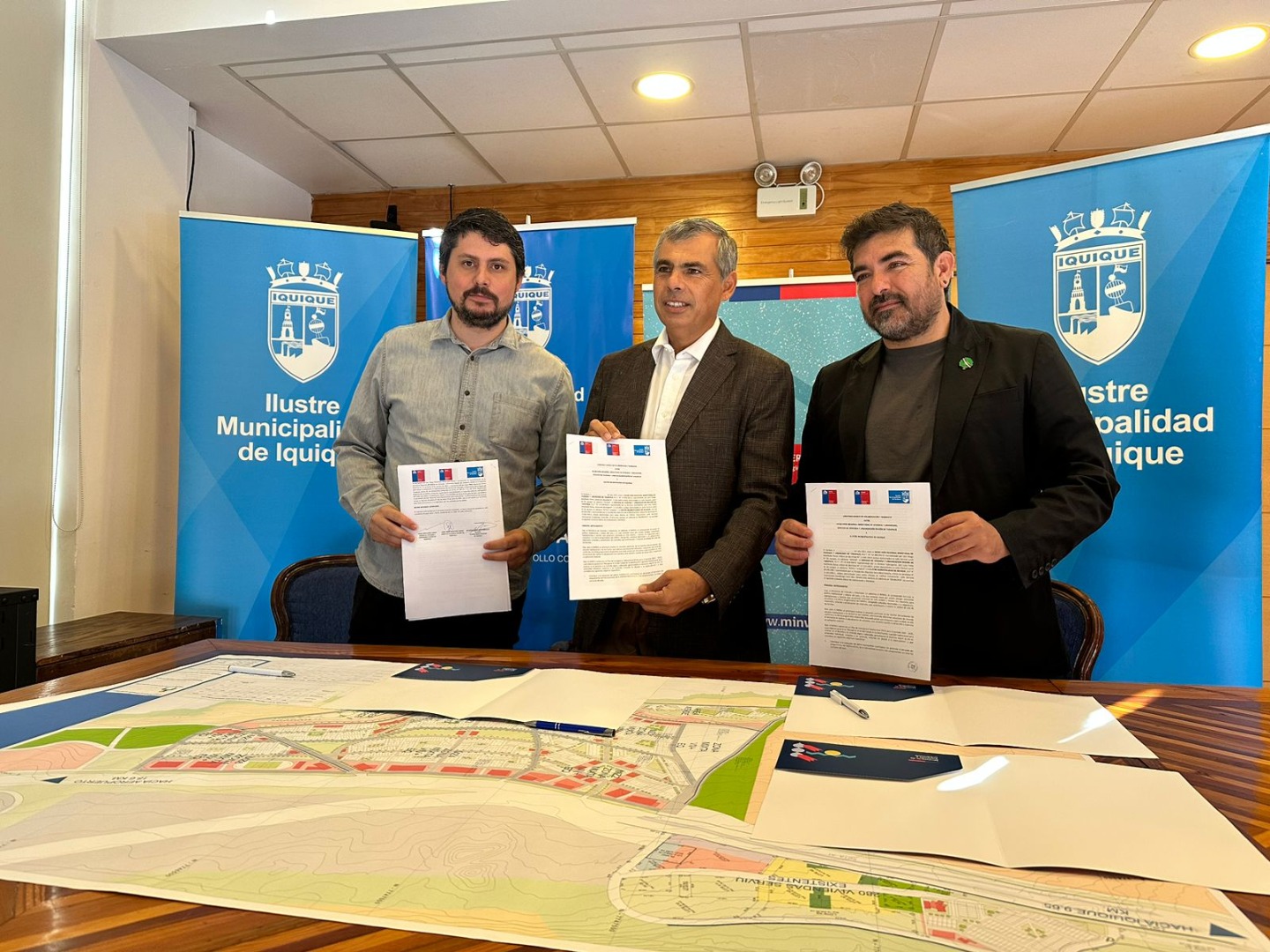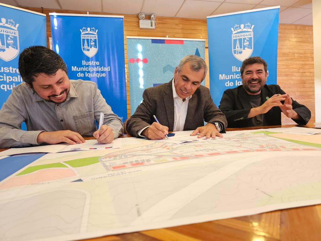 Con el estampado de las respectivas firmas del seremi Diego Rebolledo; del director regional (S) Juan Pablo Sepúlveda y del alcalde de Iquique, Mauricio Soria Macchiavello; la Secretaría Regional Ministerial de Vivienda y Urbanismo de Tarapacá, el Servicio de Vivienda y Urbanización de Tarapacá y la Municipalidad de Iquique formalizan un convenio que permitirá a los primeros dos organismos entregar asesoría técnica al tercero en el marco del Plan de Emergencia Habitacional impulsado por el Gobierno del Presidente Gabriel Boric.