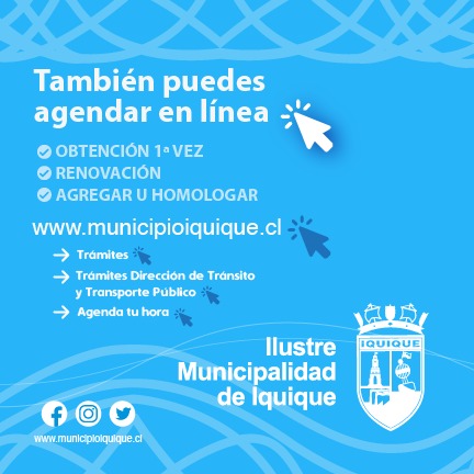 Para obtener por PRIMERA VEZ su documento, renovarlo u homologarlo, puede ingresar a WWW.MUNICIPIOIQUIQUE.CL, en la sección de trámites diríjase a “Dirección de Tránsito y transporte público” para poder agendar su hora…