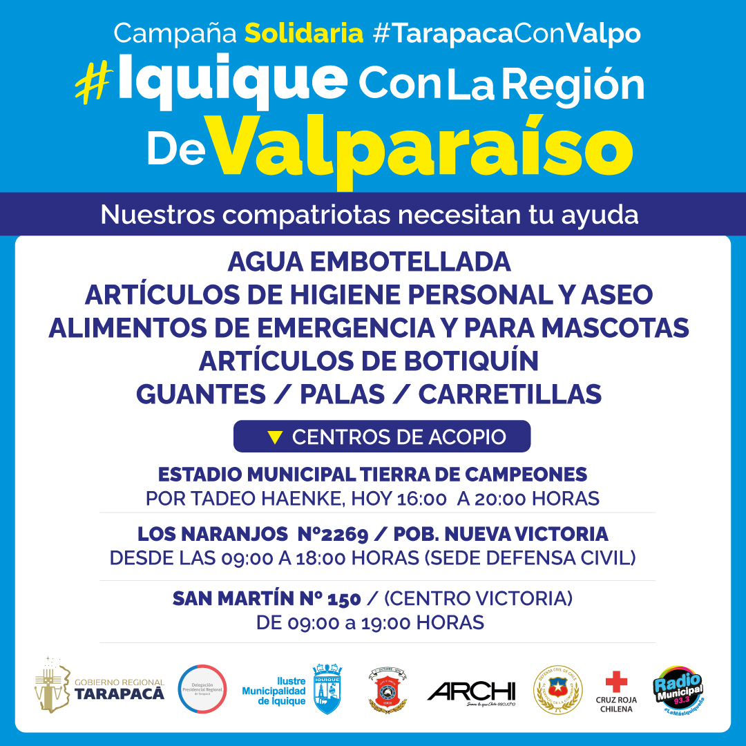 “Tuvimos una reunión de coordinación con el Gobierno Regional de Tarapacá, el Cuerpo de Bomberos de Iquique, Defensa Civil, Cruz Roja de Iquique y la Asociación de Radiodifusores de Chile buscando aunar esfuerzos para entregar ayuda a las miles de personas de la Región de Valparaíso que han perdido sus hogares. Por esto, considerando las características multipropósito de nuestro estadio, lo habilitamos para que los iquiqueños e iquiqueñas demuestren su solidaridad entregando una donación necesaria”, asegura el alcalde de Iquique, Mauricio Soria Macchiavello.