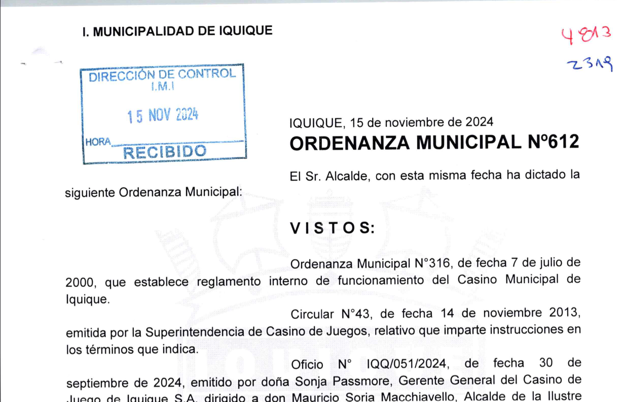 Descargue y visualice la Ordenanza Municipal N°612, de fecha 15 de noviembre del 2024, la cual establece modificaciones al Reglamento Interno del funcionamiento del Casino Municipal de Iquique.