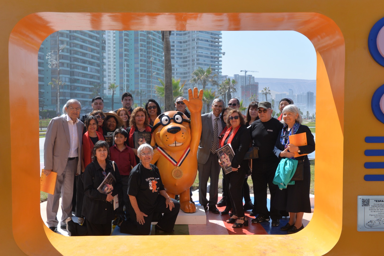 La ceremonia de entrega a la comunidad de esta obra estuvo encabezada por el alcalde Mauricio Soria Macchiavello y el concejal Domingo Campodónico Saluzzi quienes estuvieron acompañados por familiares de Carlos González Rodríguez y con la especial participación de alumnos de la Escuela “Manuel Castro Ramos”. Todos ellos disfrutaron de la presentación de la “Big Band SLEP” y el Coro Comunitario “Víctor Jara” quienes interpretaron el tema “Charagua”, música característica de TVN y que acompañó a “Tevito”.
