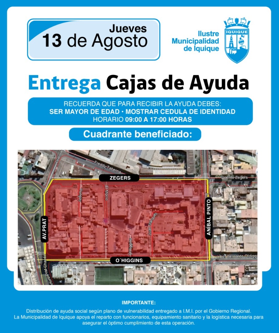 Así es como hoy se repartieron 3.300 mil canastas de víveres en el cuadrante de calle Ernesto Riquelme y Avenida Elías Lafertte, por el norte; calle Brigadier Hernán Fuenzalida y Avenida Diego Portales, por el sur; Avenida Salvador Allende por el oriente y Avenida Héroes de La Concepción y calle Luis Cruz Martínez, por el poniente.