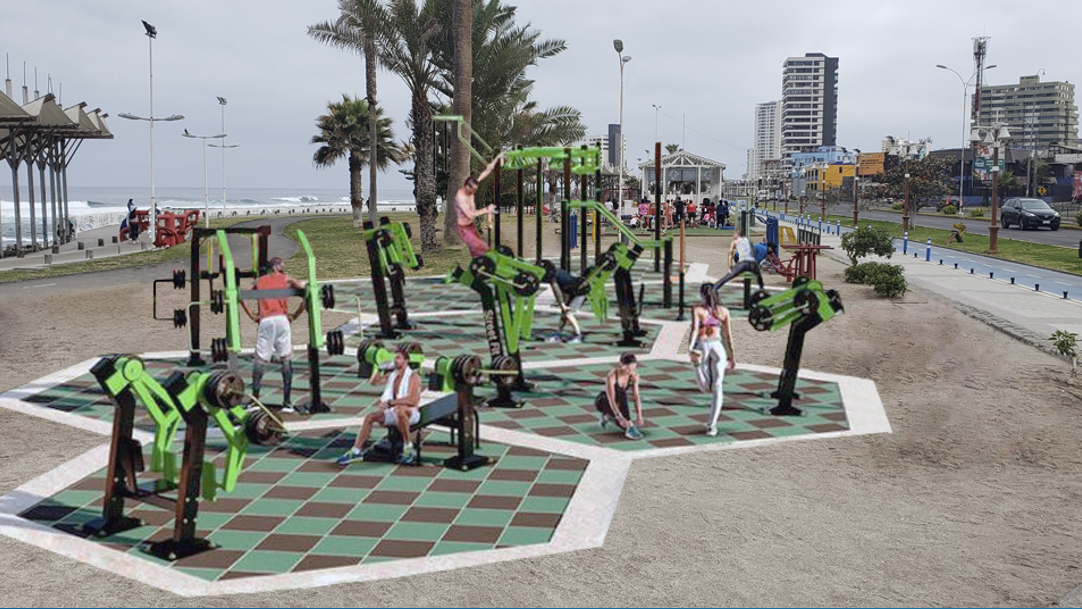 Los trabajos para este gimnasio al aire libre contemplan la instalación de un letrero indicativo, piso de caucho de alto grado de amortiguación y dos tipos de máquinas de ejercicio: Etapa de Objetivo Muscular (8 Máquinas Estáticas de Peso Variable) y para la Etapa de Objetivo Aeróbico (1 Circuito Calistenia más 4 Bicicletas Dínamo, dos para Adultos y dos para niños). En todos los casos, se contempla que estos implementos sean resistentes a la corrosión propia del borde marítimo.