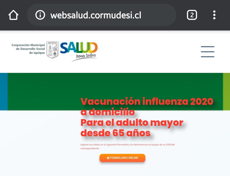 Con el objetivo de lograr que más adultos mayores se puedan sumar a la iniciativa, el Departamento de Salud de la Corporación Municipal de Desarrollo Social de Iquique ha habilitado un sitio web especial para que este sector de la comunidad pueda ser vacunado en su propio domicilio contra la influenza.