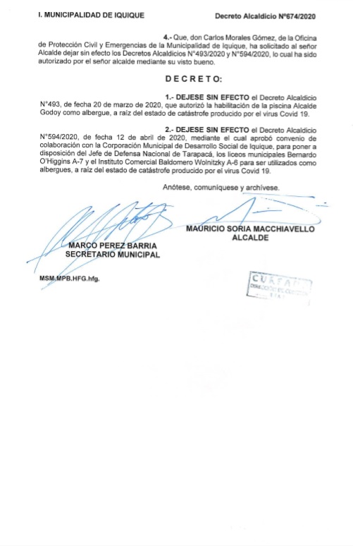 Sin embargo, tras recibir el correo electrónico con fecha 27 de abril del 2020, del Coronel de Aviación (A) Jefe del Estado Mayor del Jedena, don Óscar Zambrano Guevara, quien informó que, producto del retorno del último grupo de ciudadanos bolivianos, el Liceo Bernardo O’Higgins A-7 deja sin efecto su condición de albergue y se procederá a la sanitización del recinto para que opere como establecimiento educacional, es que se decidió que: