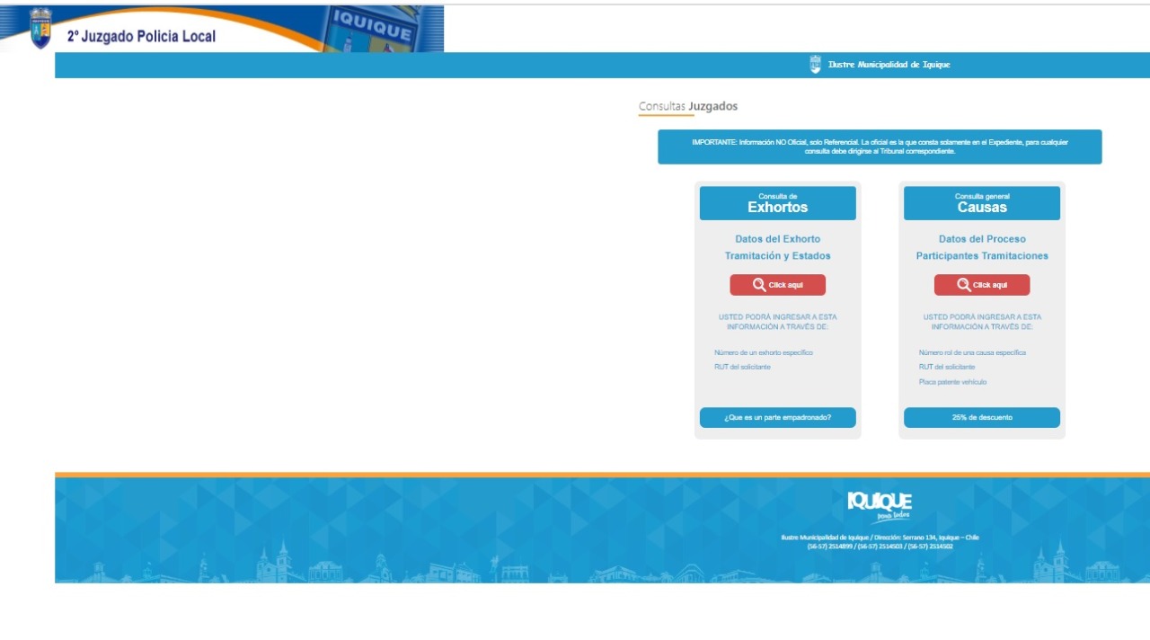 Pago de Partes Empadronados, incluyendo el 25% de descuento legal que se realiza por ley si el pago se efectúa hasta el día 5 y consultas por causas y exhortos son los trámites que se podrán realizar en el sitio web municipal. Para otro tipo de consultas, es necesario llamar a 572-514746 o escribir al correo electrónico segundojuzgado@municipioiquique.cl