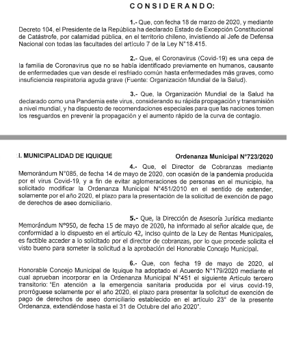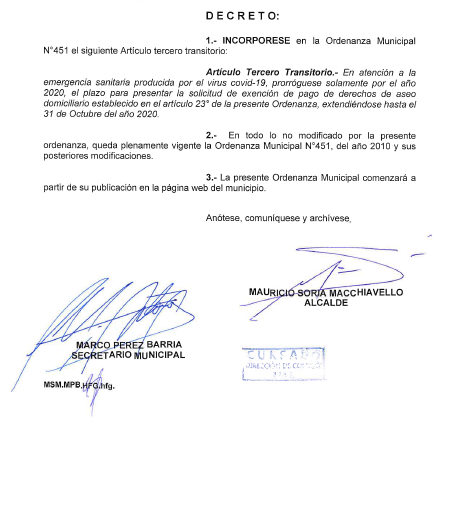 Luego de considerarse el Estado de Excepción Constitucional de Catástrofe por calamidad pública y entender que la pandemia del Covid-19, producto de una nueva cepa de la familia de Coronavirus no identificada anteriormente en humanos, el Concejo Municipal ha adoptado el Acuerdo N°179/2020, mediante el cual aprueban incorporar a la Ordenanza Municipal N°451 el siguiente artículo tercero transitorio: